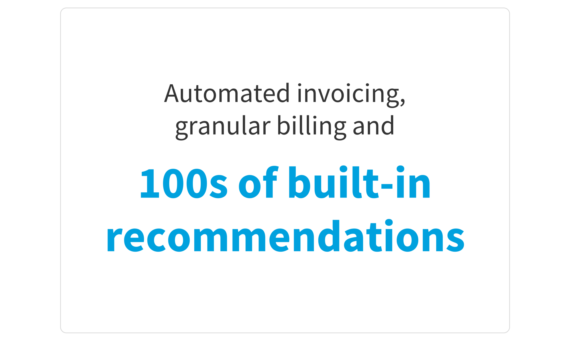 Large enterprises and MSPs can streamline cloud management with automation at every level. Hundreds of built-in recommendations, automated compliance benchmarking and self-healing for misconfigurations reduce manual effort for all. Automated invoicing, granular billing and white-label reporting further simplify complex MSP processes, freeing MSPs to focus on growth and customer value.